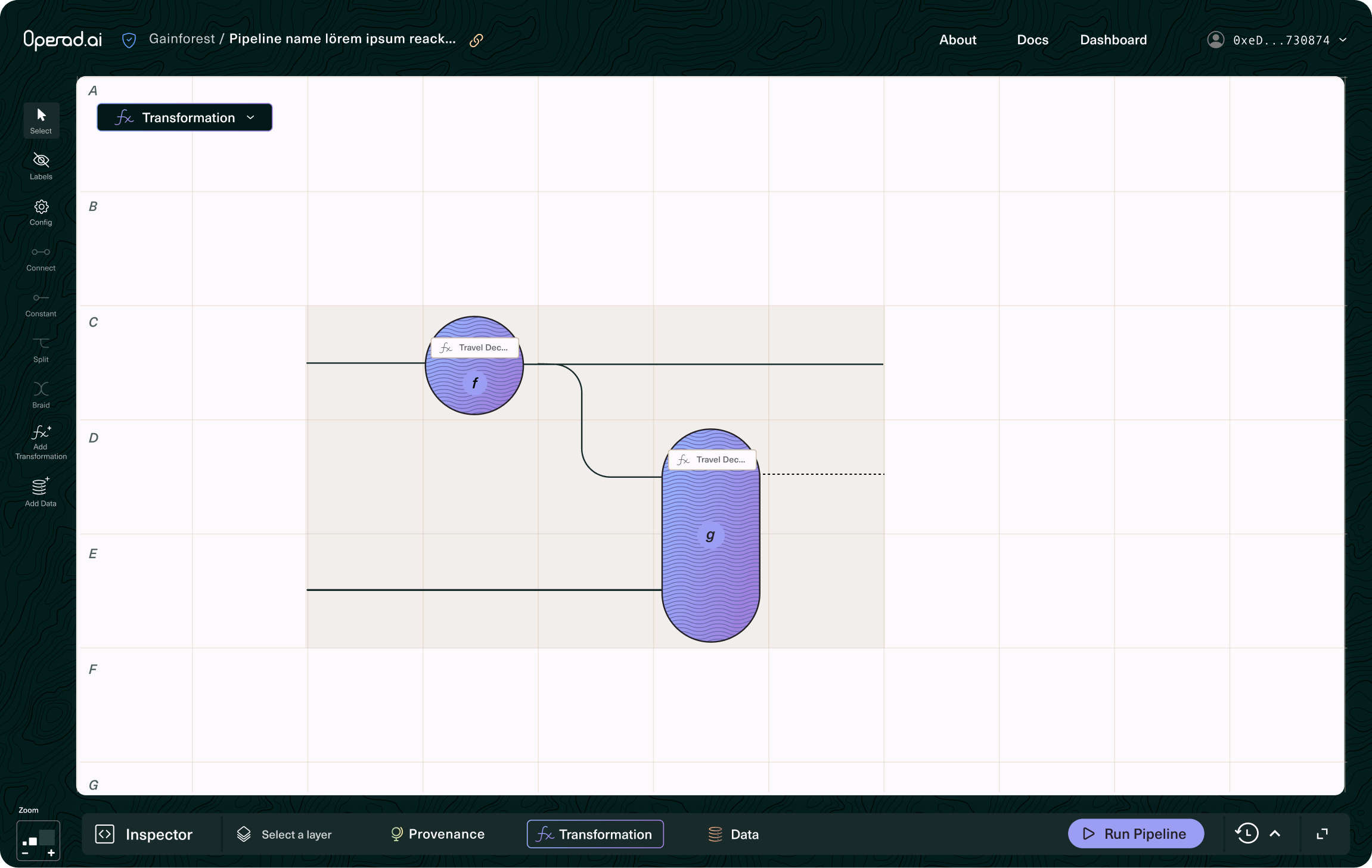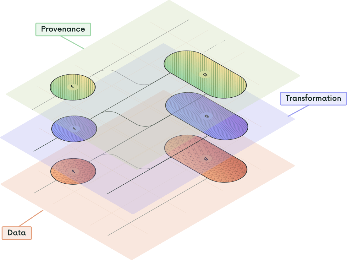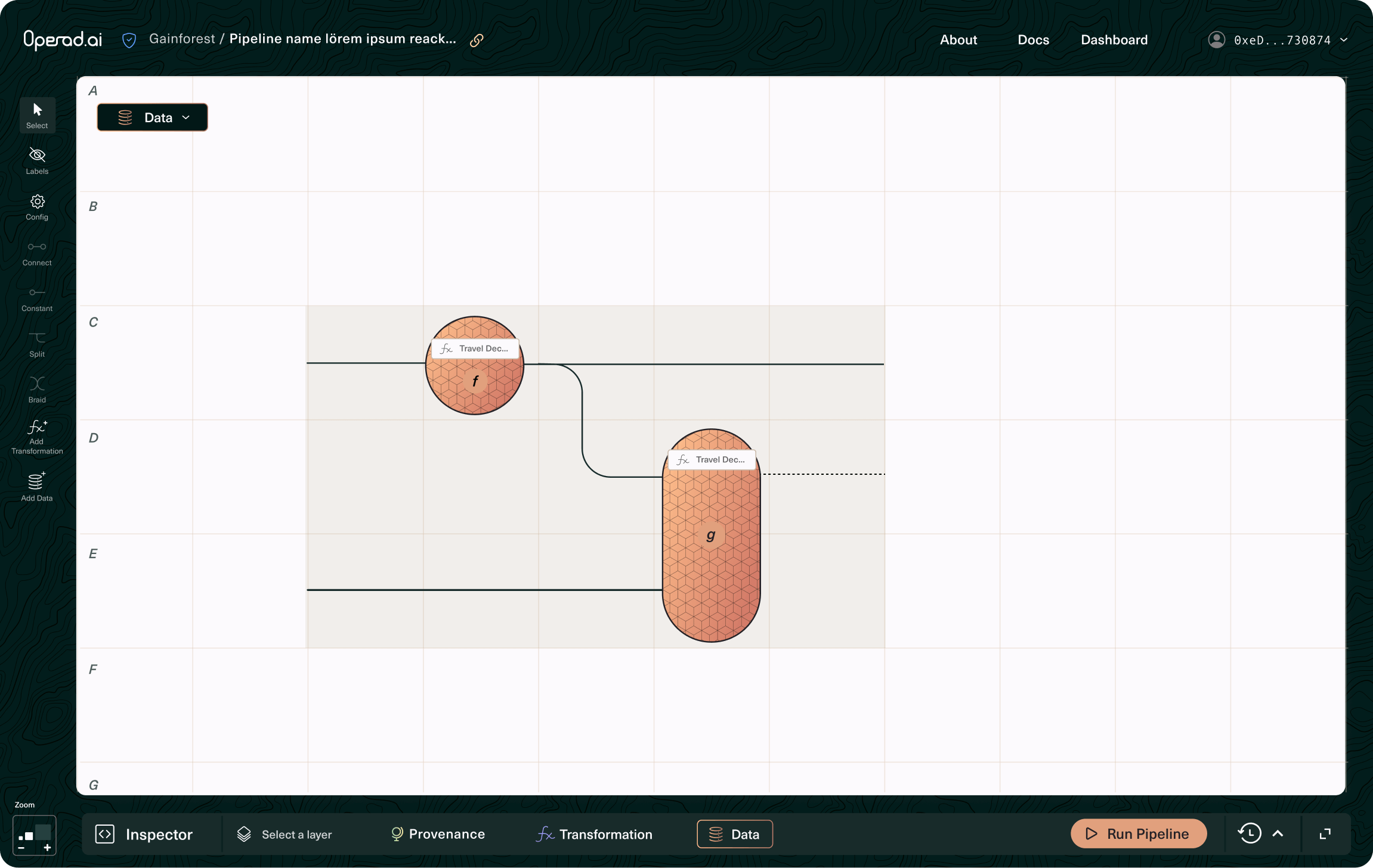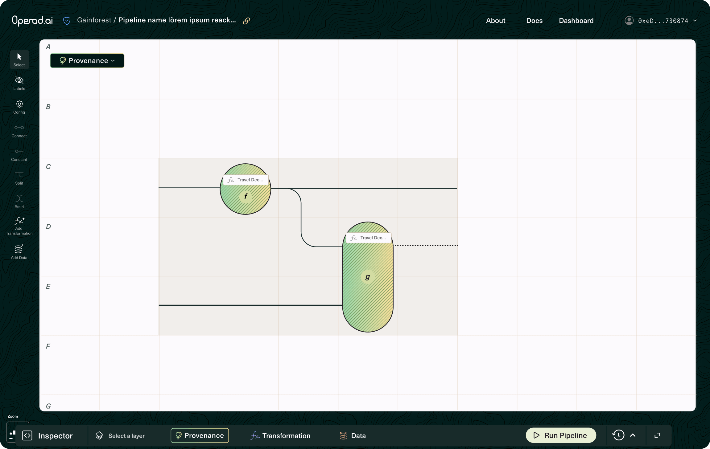 The Operad.ai grid visualizes three layers of the same flow path: data, transformations, and provenance. Together they comprise a system that makes claims traceable and verifiable.